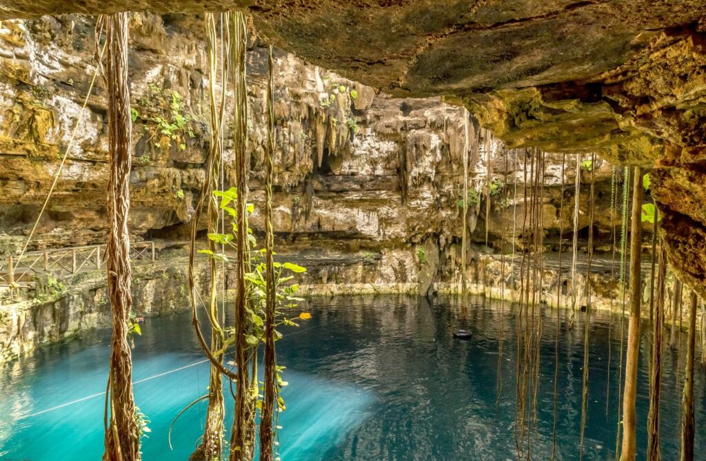 The word “cenote” comes from the Mayan term dz’onot or ts’ono’ot, which means “sacred well.” These natural formations are typical of limestone regions, such as Mexico’s Yucatán Peninsula.