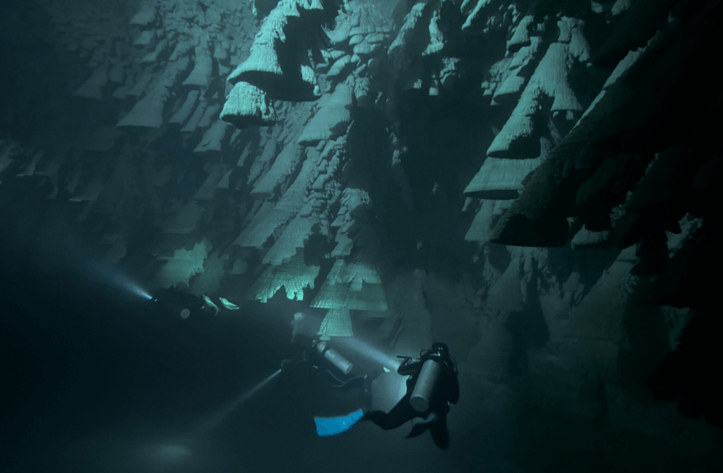 The site also features an impressive network of caves and flooded passages, forming one of the most remarkable underwater systems in the region.