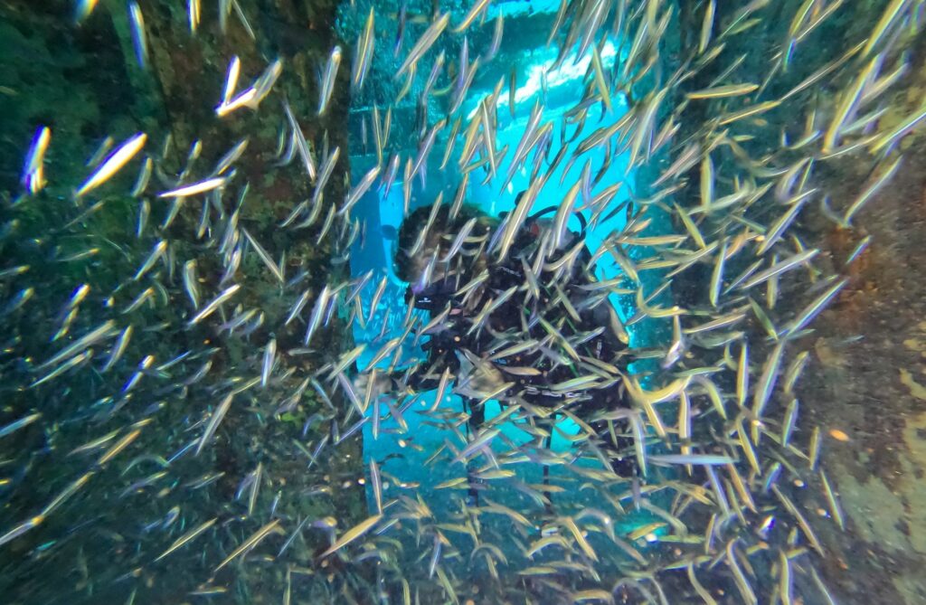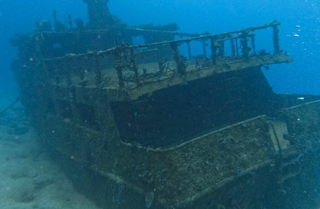 Ses cabines et ponts intérieurs abritent aujourd’hui des bancs permanents de poissons argentés (glassy sweepers), tandis que les murènes vertes, barracudas, homards et tortues ont élu domicile autour de l’épave.