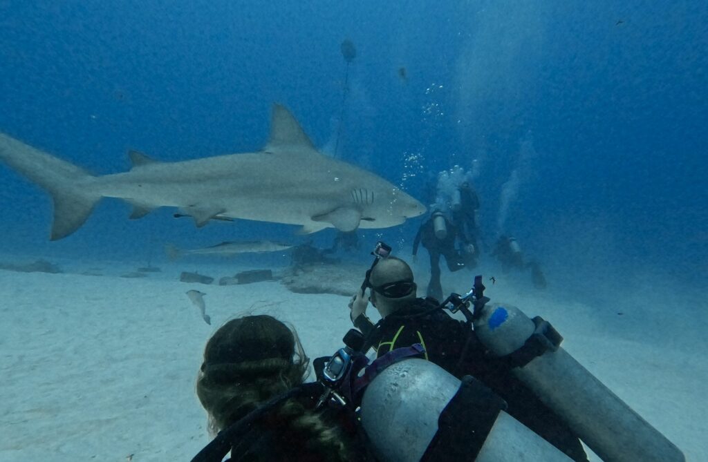 L’approche vient toujours des requins eux-mêmes. Les plongeurs restent calmes, généralement à genoux ou allongés sur le fond, pendant que les instructeurs, très expérimentés dans ce type de sortie, encadrent l’observation de manière respectueuse.