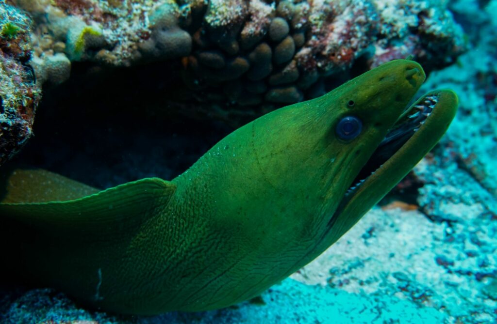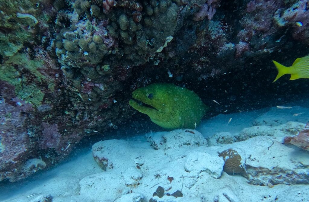 À Playa del Carmen, les murènes sont régulièrement observées lors des plongées. Elles se cachent dans les anfractuosités des récifs. Leur corps allongé et leur tête, souvent visible à l’entrée de leur abri, les rendent facilement reconnaissables.